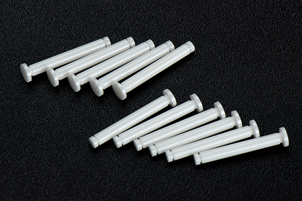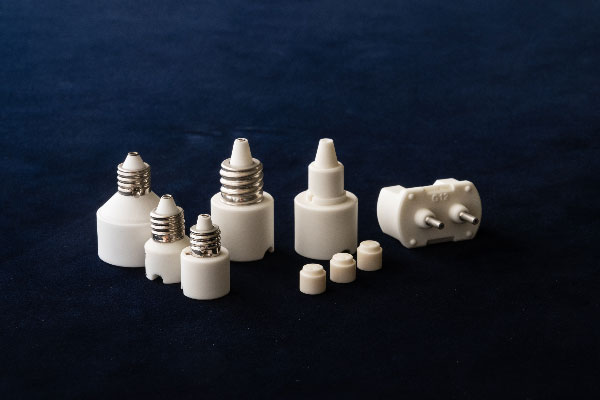 高純度アルミナ、ジルコニア、またサファイアなどを用いた微細加工の一例です。電子部品ソケットや半導体の生産ラインなどで必要とされる、1/100mm の加工精度を求められる部品です。